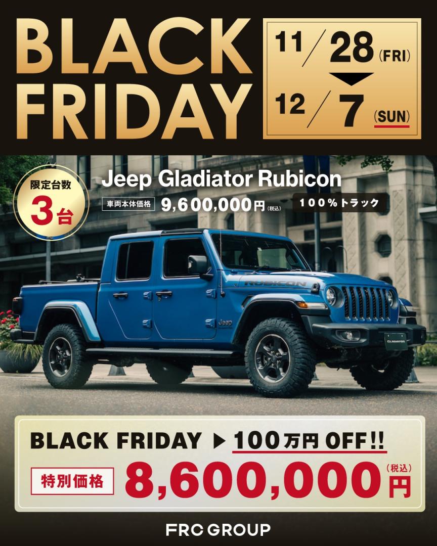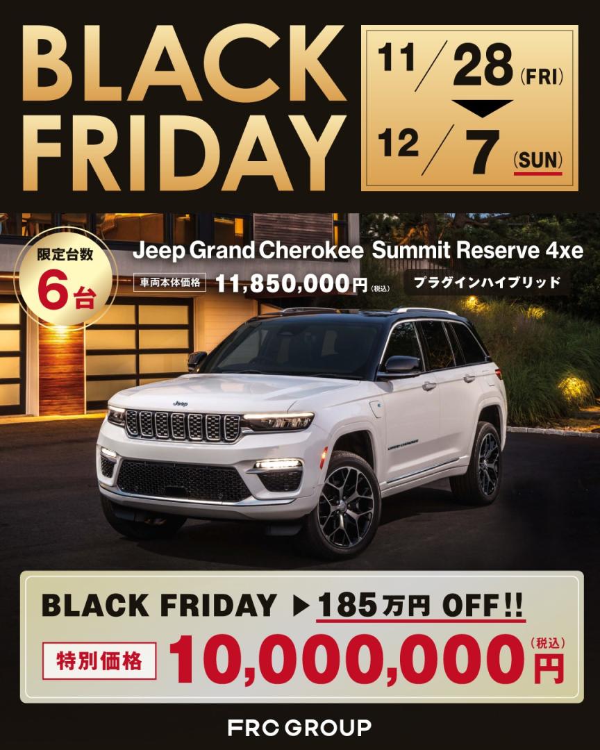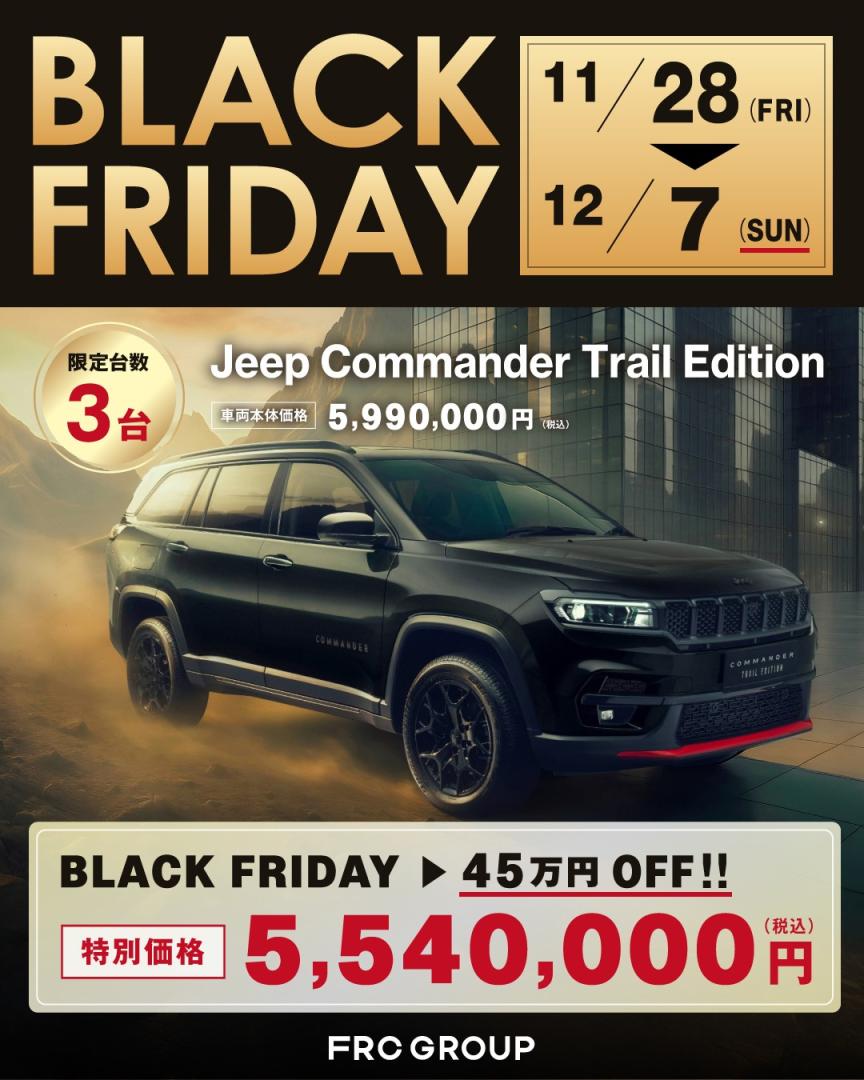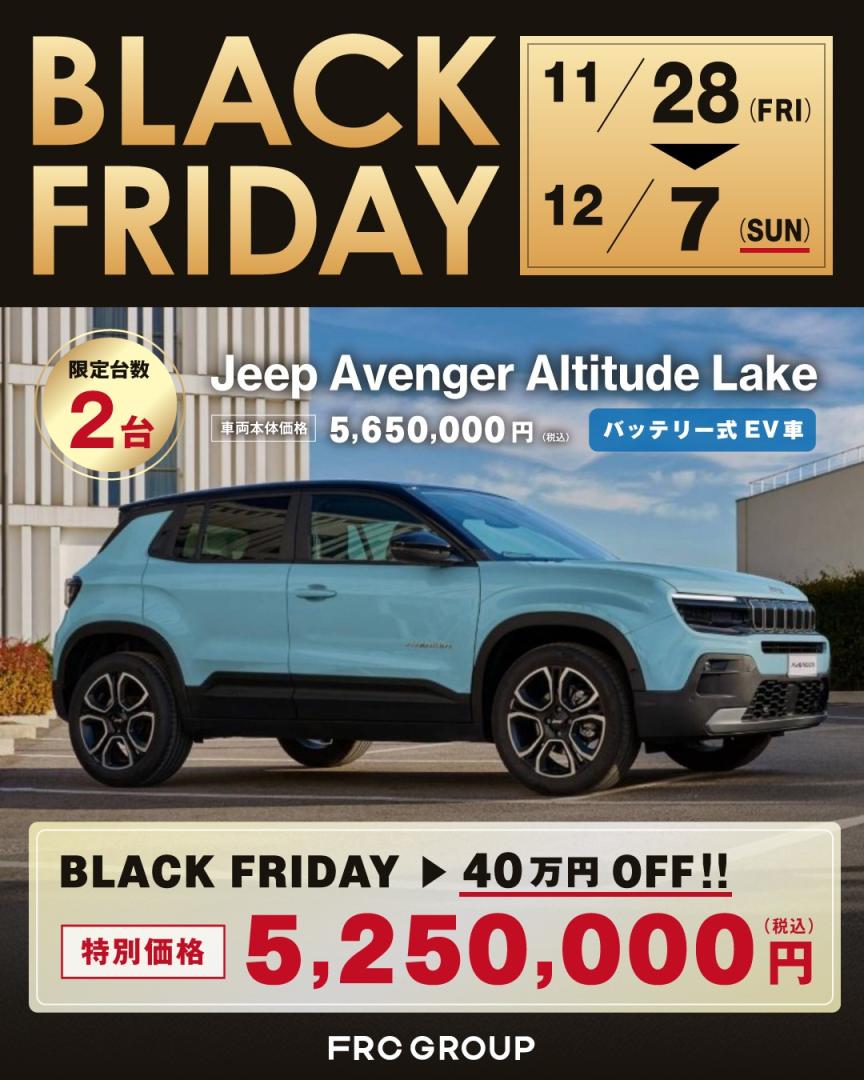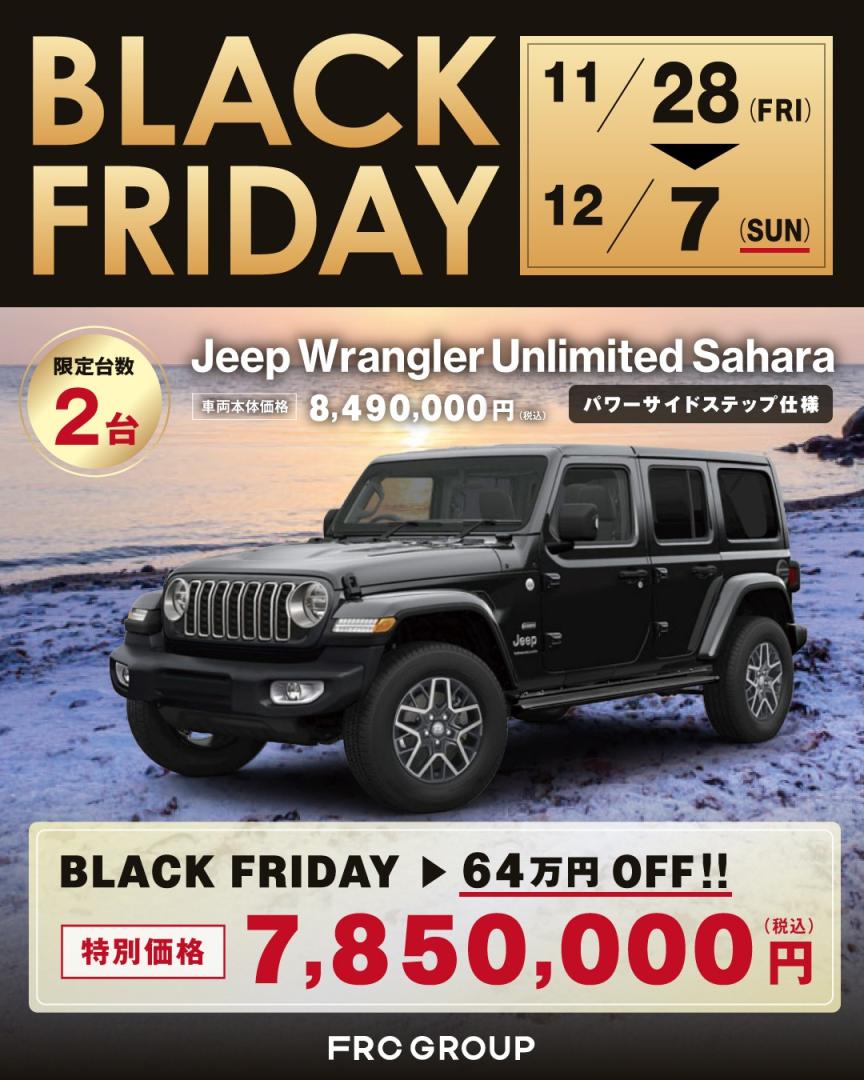 こんにちは!ジープ春日井です😄✨🖤🖤BLACK FRIDAY🖤🖤🖤🖤2025.11.25-12.7🖤🖤明日よりブラックフライデーを開催いたします✨台数限定でお得にお車を購入できるチャンス🖤車種、グレードは画像をご覧くださいませ✨✨気になる方はお早めにお問い合わせくださいませ❗️皆様のご来店を心よりお待ちしております✨✨#blackfriday #ブラックフライデー